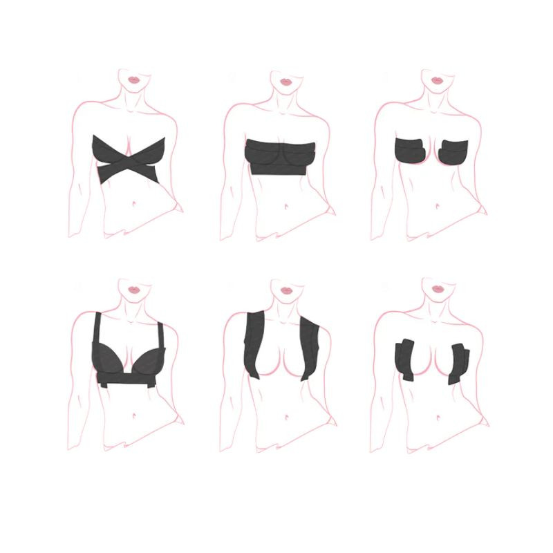 Booby Tape Fita permite usar roupas sem alças, sem costas e decotes profundos. Foi desenvolvida para mulheres de todos os tamanhos e formas.