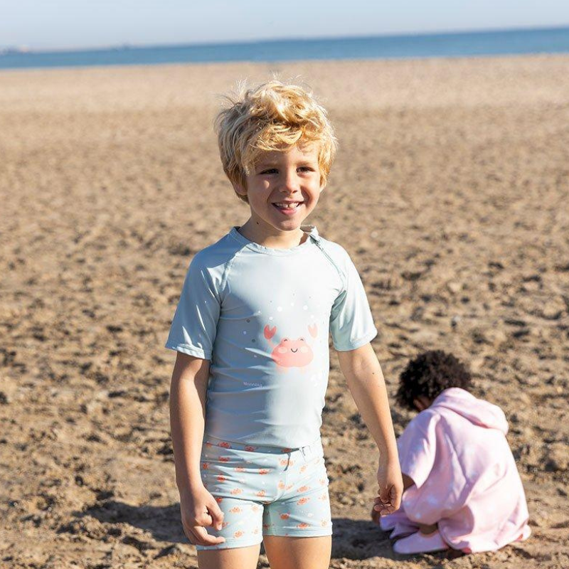 Para crianças a partir dos 2 anos o Calção Curto Monnëka com estampado de caranguejos, é feito com tecido especial que protege a pele dos raios solares, ideal para os dias de sol.