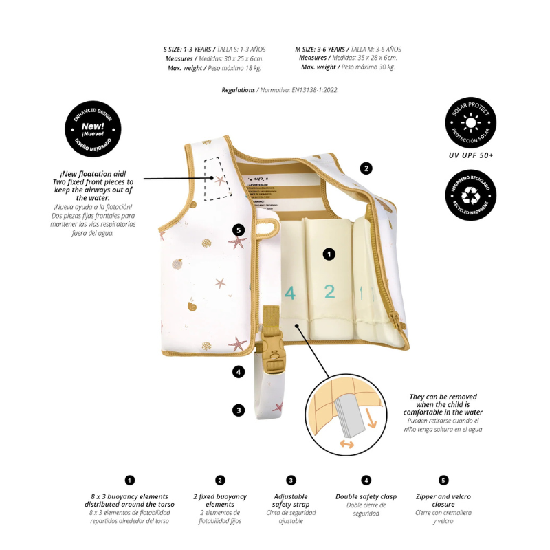 O Colete Flutuante Aprendizagem Sea La Vie Saro é a escolha ideal para o teu pequeno aprender a nadar de forma segura e confortável. Feito com materiais reciclados, é suave e perfeito para a praia ou piscina!