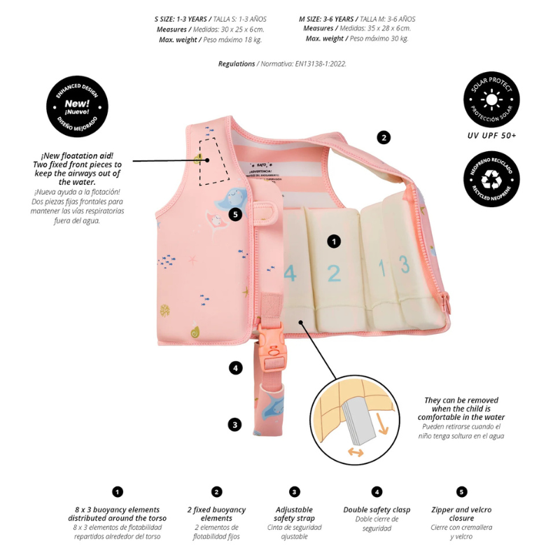 - Com 8 compartimentos e 3 peças de flutuação removíveis por compartimento, o colete permite ajustar gradualmente a flutuação conforme a criança ganha confiança na água;