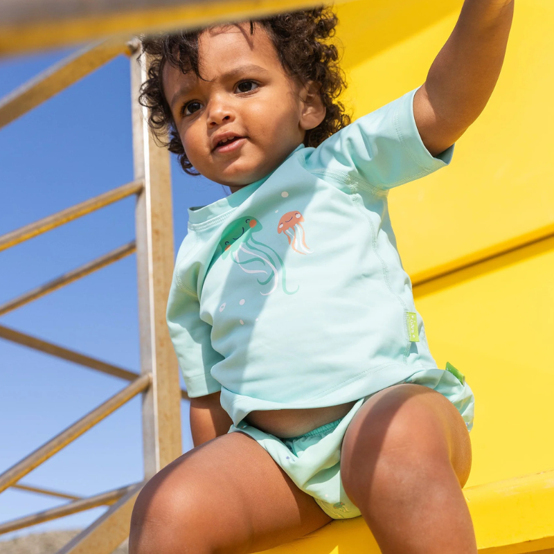 - Feito com um tecido leve e delicado, respeita a pele sensível e proporciona conforto, mesmo quando molhado. Além disso, oferece proteção solar UV UPF 50+, cuidando da pele dele enquanto se diverte ao sol.