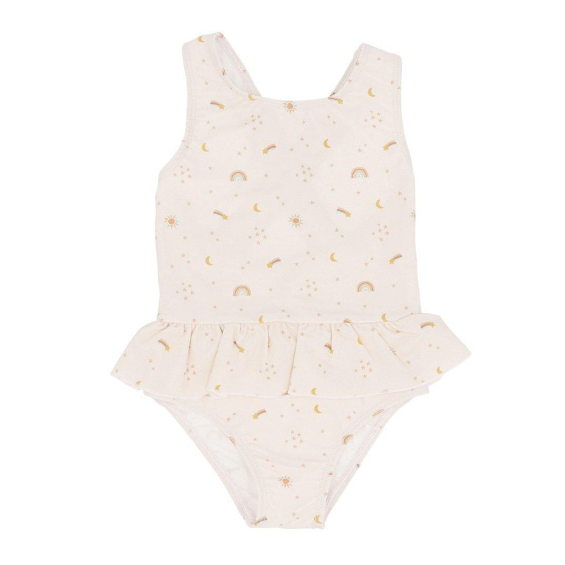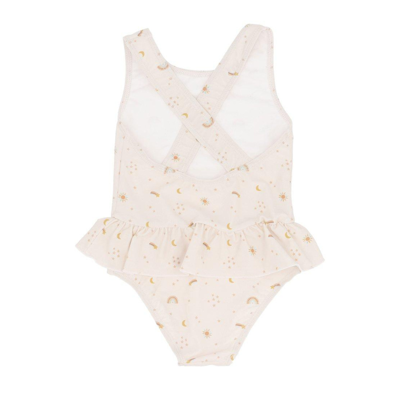 Fato de banho Monnëka Starlight com alças cruzadas e folhos delicados. Confortável, leve e perfeito para dias de sol. Tamanho M (3-4 anos).
