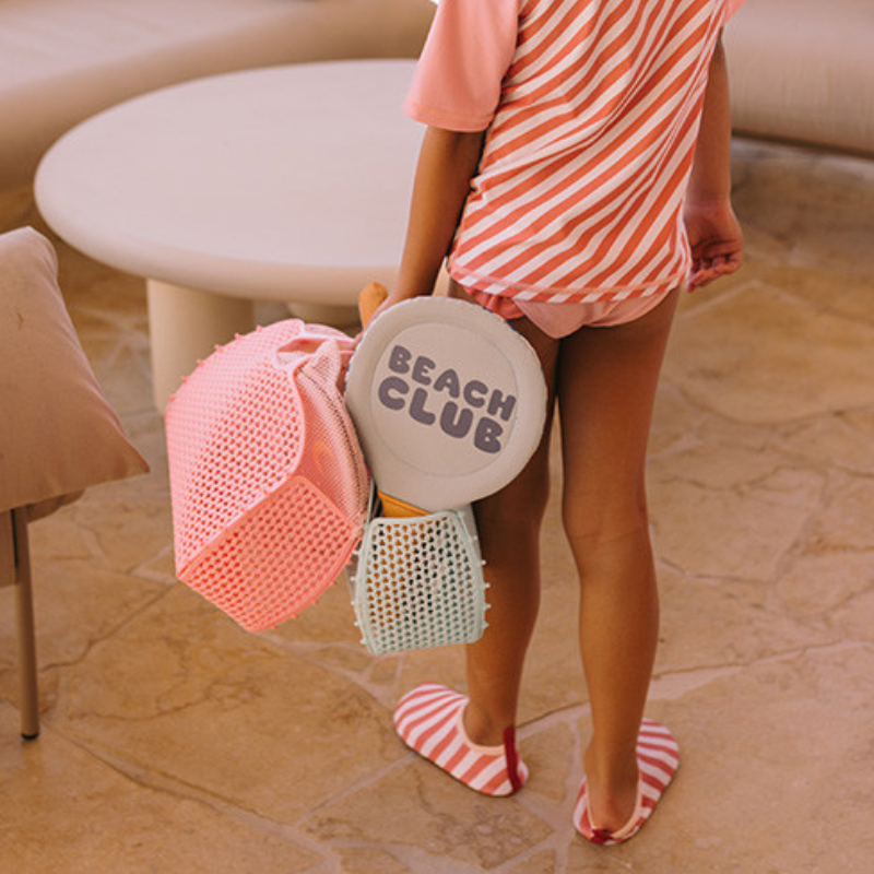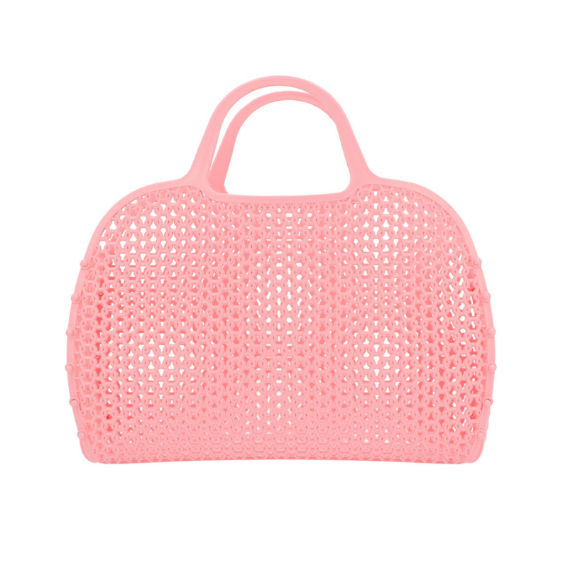 Saco de praia rosa Monnëka Retro Vintage em LDPE reciclável. Leve, desmontável e fácil de limpar. Grade ventilada evita acumulação de areia. Dimensões: 25x30x10 cm. Ideal para praia, piscina e passeios.