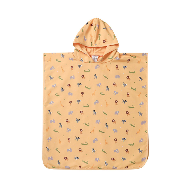 O Poncho de Praia da Monnëka foi feito para os momentos depois do banho. Envolve, absorve, seca num instante. O capuz protege a cabeça, o bolso guarda os tesouros, e o design alegre faz com que os miúdos queiram usá-lo mesmo depois de secos.