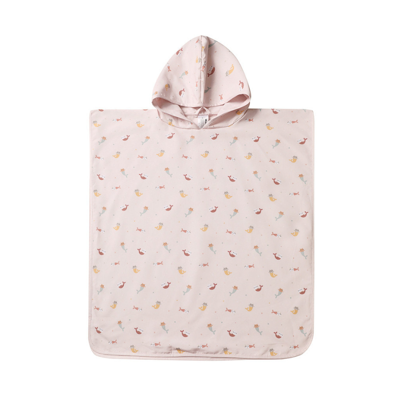 Poncho de praia tamanho S (60x60 cm). Em poliéster de secagem rápida, macio e absorvente. Com capuz e bolso frontal. Lavável a 40°C. Idade recomendada: 1 a 3 anos.