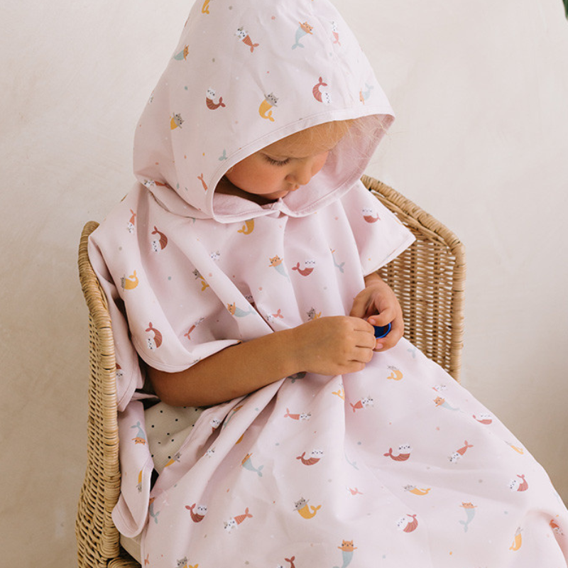 O Poncho de Praia da Monnëka foi feito para os momentos depois do banho. Envolve, absorve, seca num instante. O capuz protege a cabeça, o bolso guarda os tesouros, e o design alegre faz com que os miúdos queiram usá-lo mesmo depois de secos.