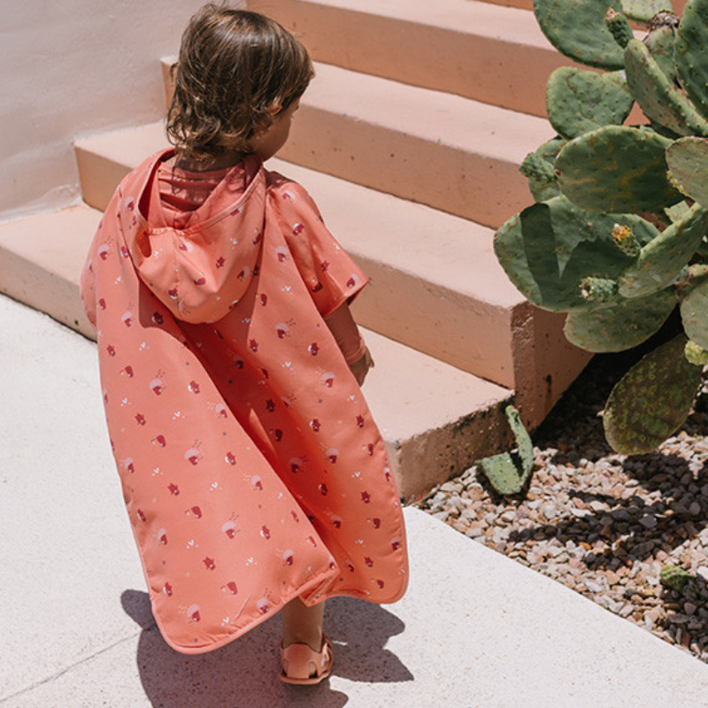 O Poncho de Praia da Monnëka foi feito para os momentos depois do banho. Envolve, absorve, seca num instante. O capuz protege a cabeça, o bolso guarda os tesouros, e o design alegre faz com que os miúdos queiram usá-lo mesmo depois de secos.