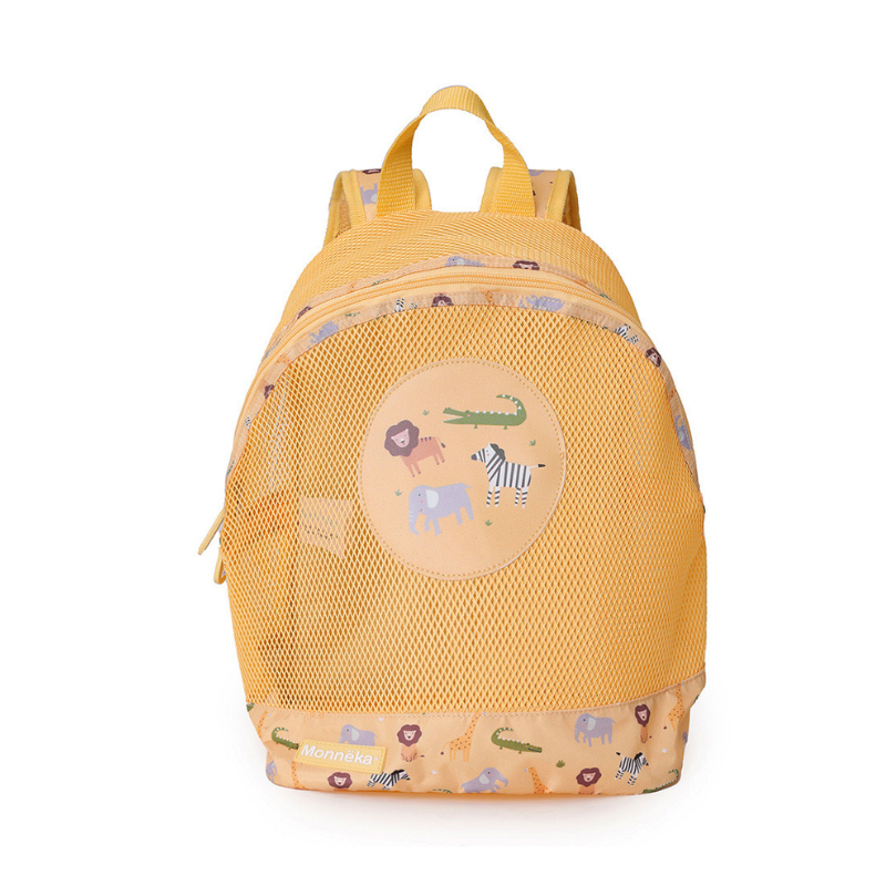 Mochila infantil anti-areia Monnëka Wild Animals. Design ventilado, impermeável, com clipe peitoral e alças ajustáveis. Medidas: 30,5x24x18 cm. Peso 150g. Lavável a 30°. Para crianças dos 3 aos 10 anos.