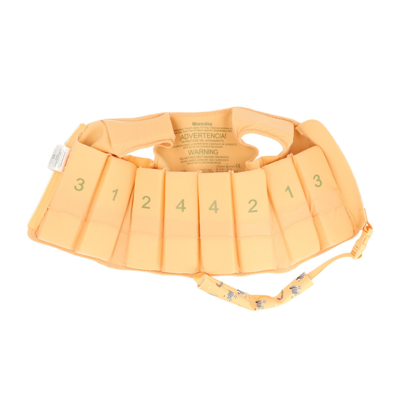 O Colete Flutuante da Coleção Verão 2026 Monnëka foi desenhado para os pequenos que estão a dar os primeiros passos dentro de água. Com flutuadores que se vão tirando um a um, à medida que a criança ganha segurança. Com uma fita entre as pernas que impede o colete de subir. Com proteção nas axilas, fecho robusto e um design que respeita os movimentos dos braços.