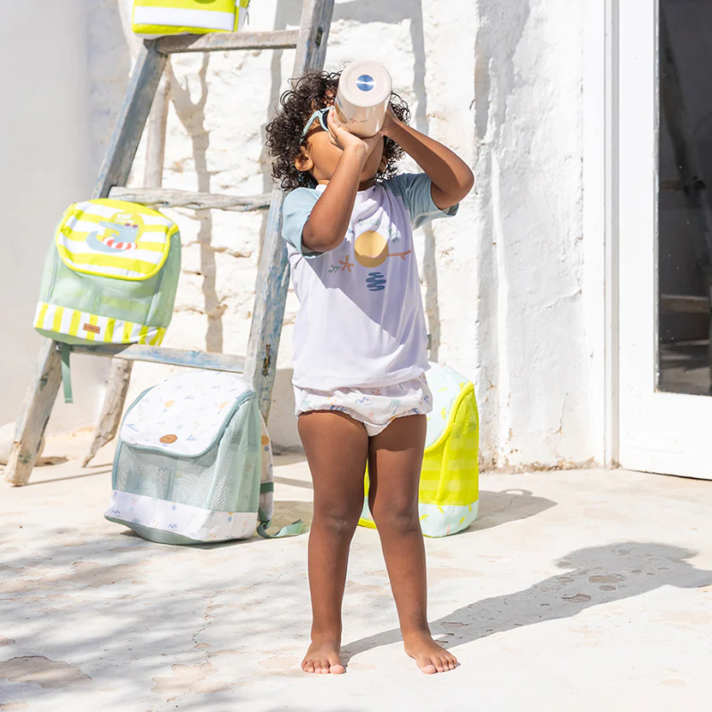 Resistente à água e desenhada para evitar fugas – contenção segura, sem acidentes. Proteção solar UV UPF50+. Tecido leve e delicado, respeita a pele sensível. Conforme normas EN 13758. Lavável na máquina (ciclo delicado a 30°C).