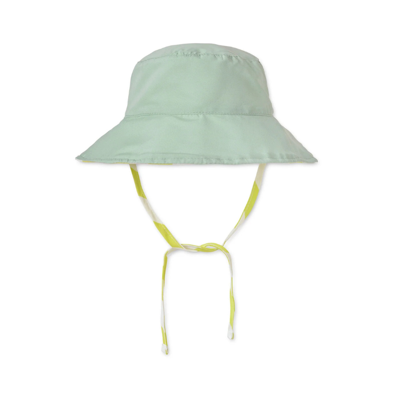 Chapéu solar reversível Saro Tropicool Mint para bebés 0-6 meses (diâmetro 45cm). Proteção UPF50+, viseira que cobre nuca e rosto, cordões de ajuste. Tecido suave, lavável na máquina. Dois chapéus num só.