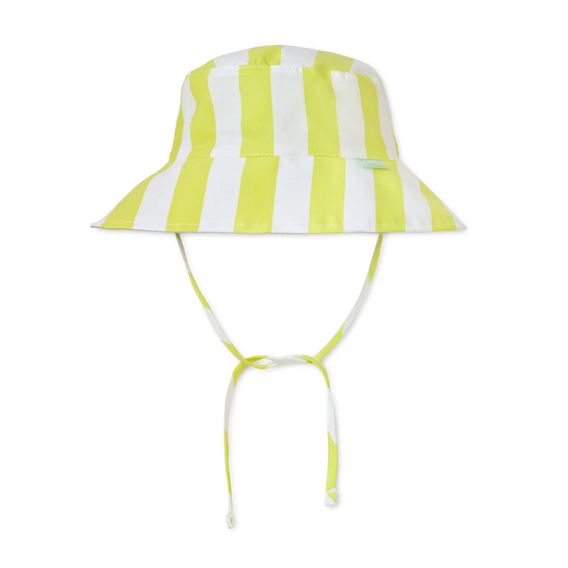 Chapéu solar reversível com padrão às riscas Saro Fun In The Sun para crianças 0-6 meses (circunferência da cabeça 45cm). Proteção UPF50+, viseira que cobre nuca e rosto, cordões de ajuste. Lavável na máquina.