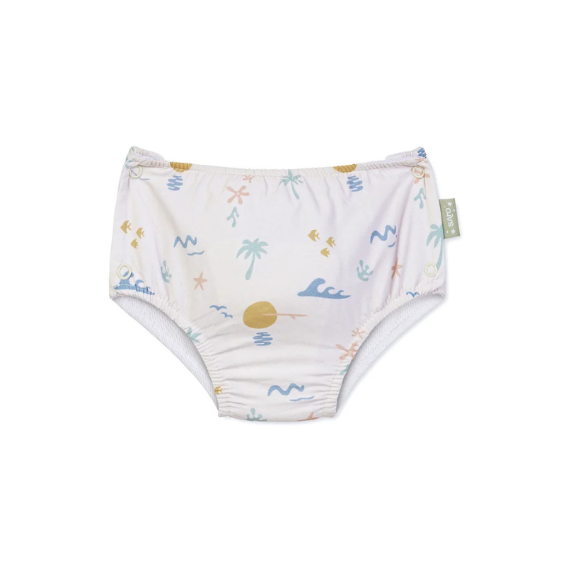 Os primeiros mergulhos merecem a primeira fralda de banho. Segura, confortável e com proteção solar.