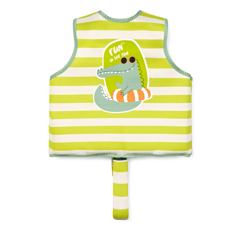 Fabricado em neoprene reciclado, é suave ao toque, com costuras delicadas e cavas largas que permitem liberdade total de movimentos, tornando-o muito confortável para brincar na água.