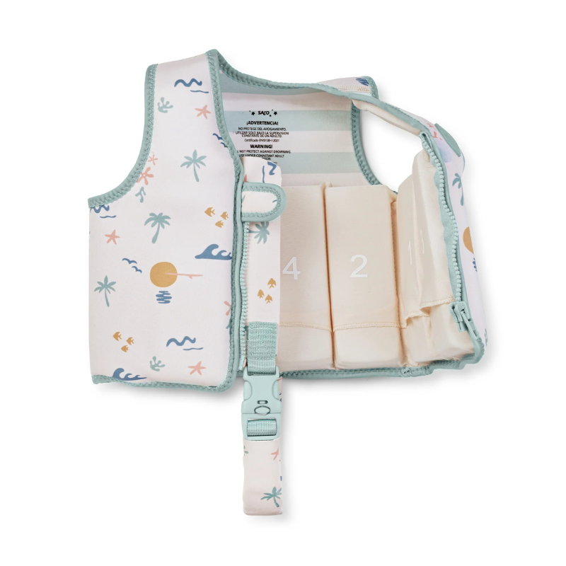 Equipado com 26 peças de flutuação, permite ajustar gradualmente a capacidade de flutuação à medida que a criança evolui. Inclui 2 peças fixas na zona superior frontal, que ajudam a manter a posição correta na água e as vias respiratórias fora de água, e 24 peças removíveis distribuídas pelo tronco, garantindo uma adaptação suave e segura.