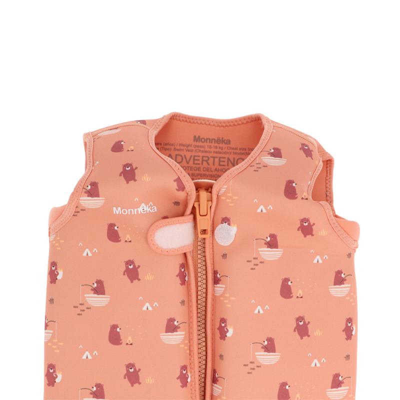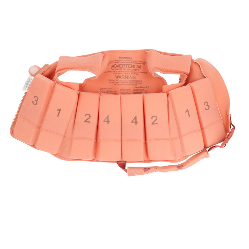 Colete flutuador Monnëka Camping para crianças 3-6 anos (19-30 kg). Com 24 elementos de flutuação removíveis, cinta entrepernas e proteção nas axilas. Certificado EN13138-1.