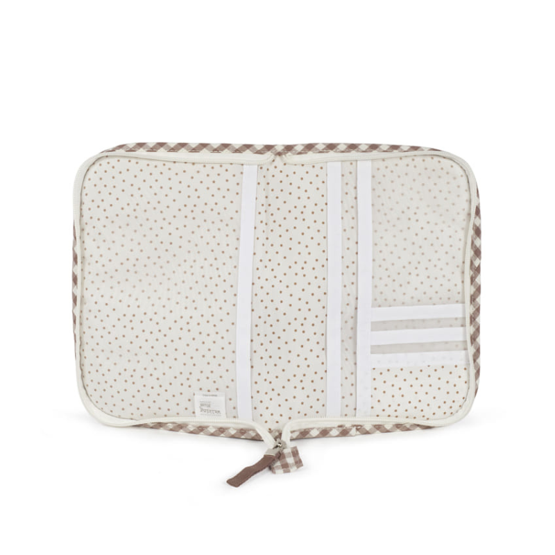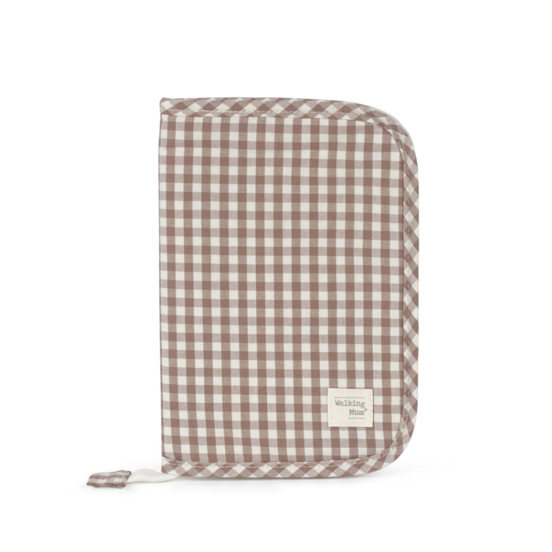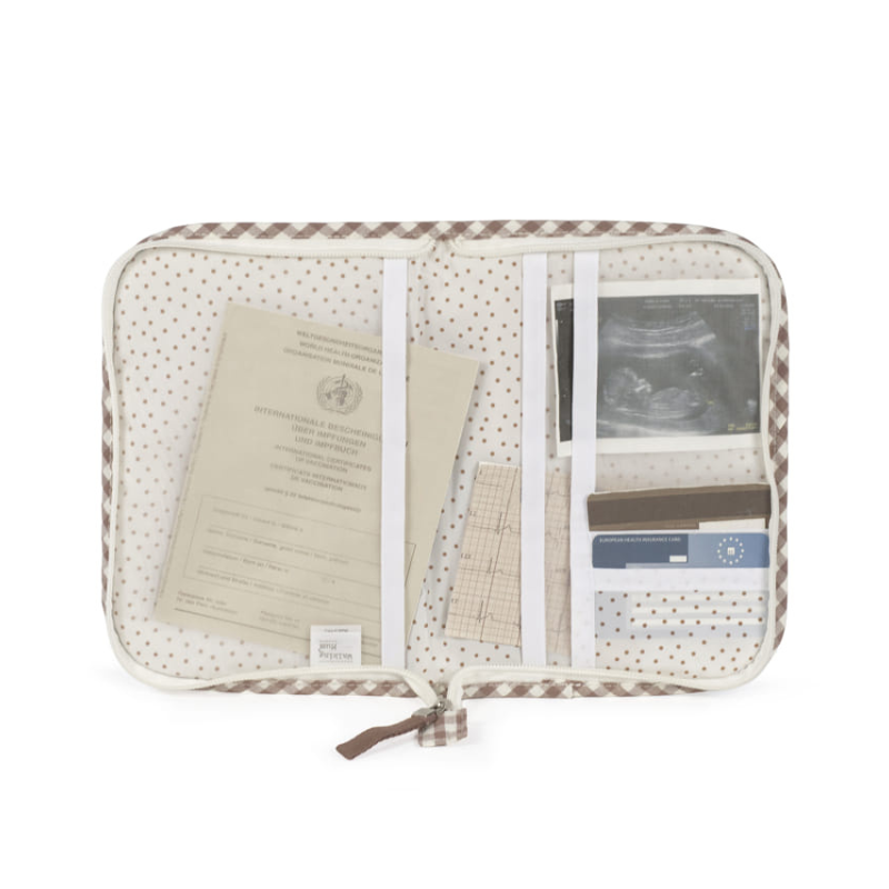 Porta documentos de bebé com padrão aos quadrados, vários bolsos e fecho zip. Prático, resistente e ideal para o dia a dia.