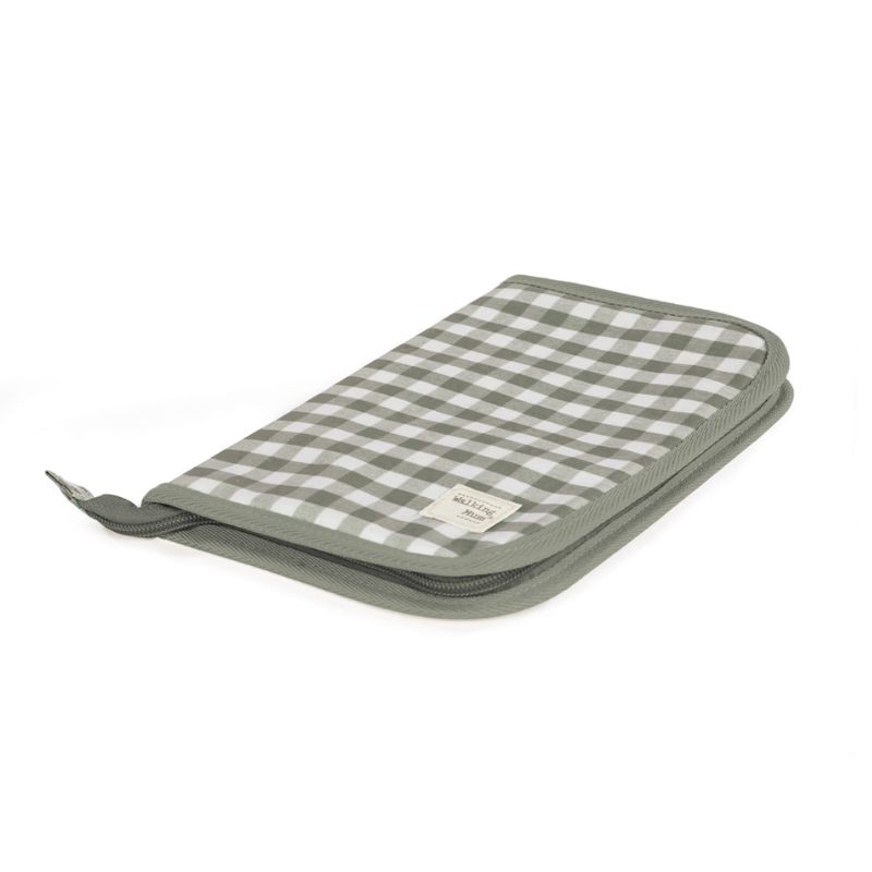 Porta documentos de bebé com padrão aos quadrados, vários bolsos e fecho zip. Prático, resistente e ideal para o dia a dia.