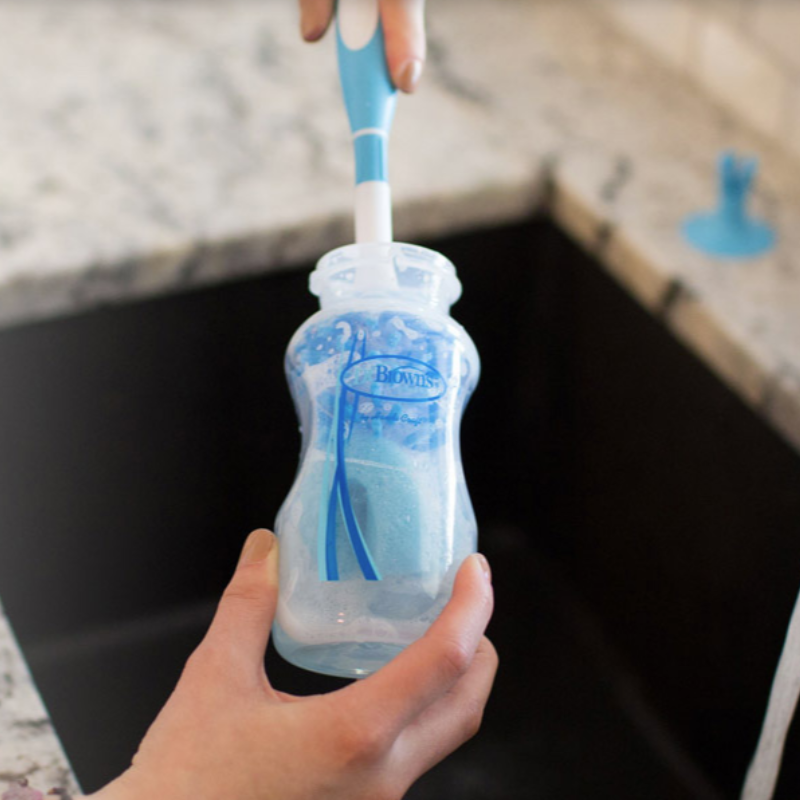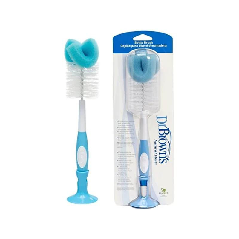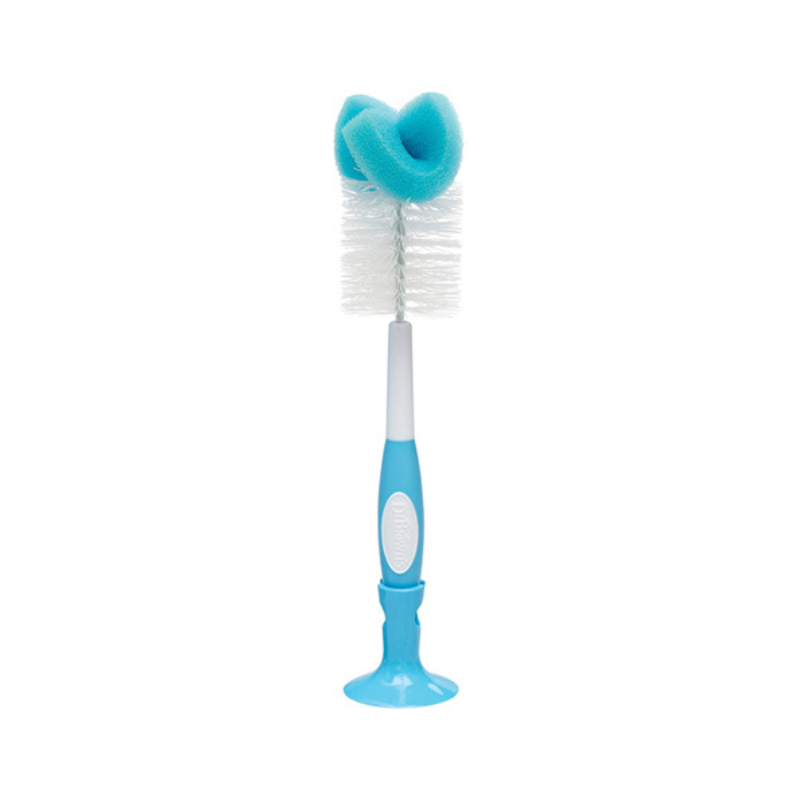 Escovilhão de limpeza Dr. Brown's para biberões e tetinas. Combinação de esponja e cerdas para limpeza profunda. Cabo antideslize, extremidade para tetinas e base com ventosa. Essencial para a higiene do bebé. Livre de BPA.