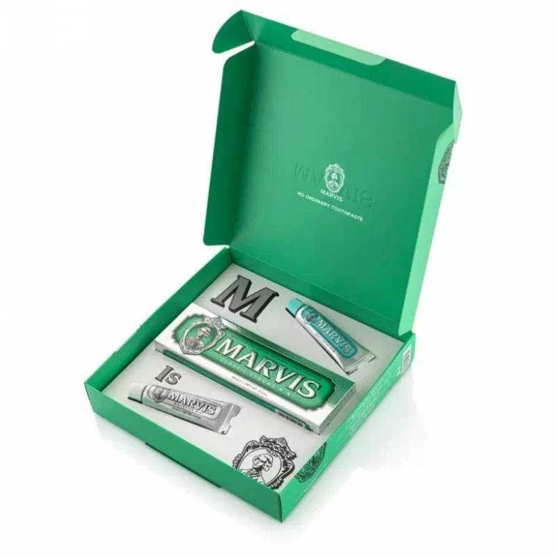Marvis Kit The Mints é uma caixa elegante composta por três pastas de dentes com sabor a menta. Ideal para oferecer como presente.