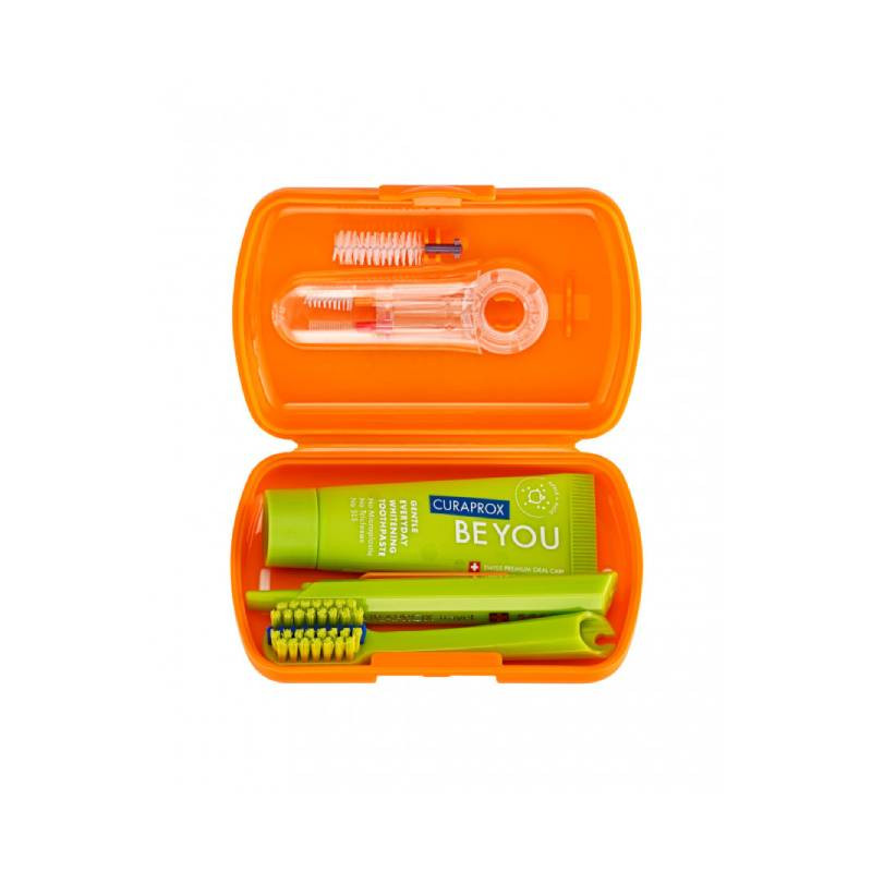 Curaprox Ortho Kit de Viagem Laranja é composto por uma escova de dentes ortodôntica, uma pasta de dentes branqueadora sabor a maçã e aloé vera e três escovilhões interdentários com suporte duplo.
