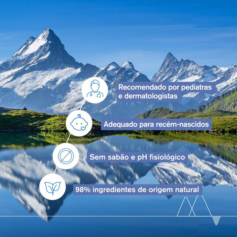 Limpa, suaviza e protege a pele delicada do bebé com 98% de ingredientes naturais. Sem sabão, com Água Termal e Edelweiss biológico. Uso diário.