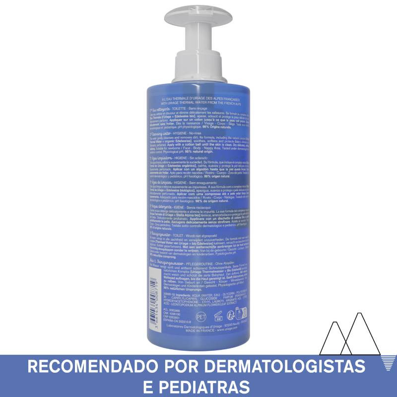98% de ingredientes de origem natural - Fórmula biodegradável de acordo com a norma OCDE301F/OECD301F - Complexo [Água Termal de Uriage + Edelweiss Biológico]. Sem sabão - pH fisiológico - Testado sob controlo pediátrico - Não seca a pele - Deixa a pele suave - Perfume agradável.
