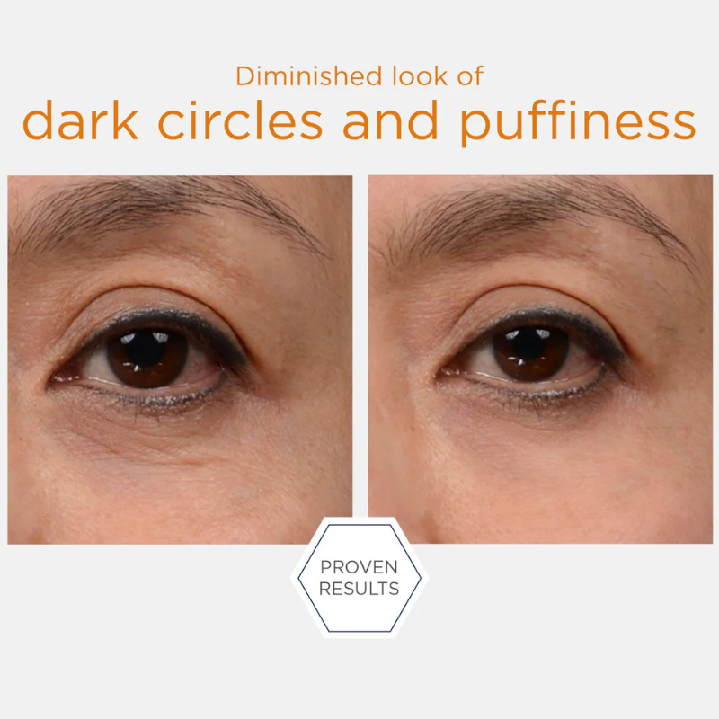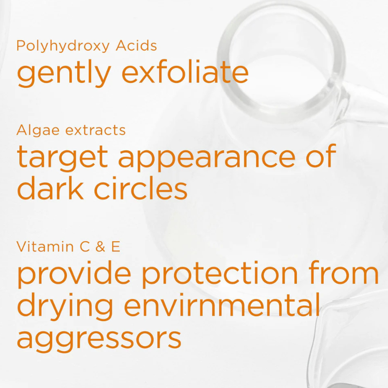 - Com Antioxidantes, Péptidos, Extratos de Algas e Vitaminas C & E, atua nas principais causas das olheiras. Os 5% de PHAs (Gluconolactona & Ácido Lactobiónico) hidratam e iluminam, melhorando visivelmente a textura fina sob os olhos.