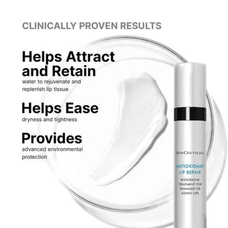 SkinCeuticals Antioxidant Lip Repair com emolientes botânicos especiais hidratam e recuperam os lábios secos e desidratados para suavizar as linhas profundas do lábio, proporcionando lábios preenchidos e saudáveis.