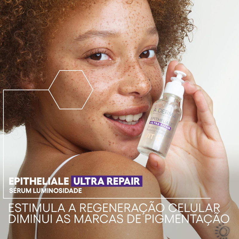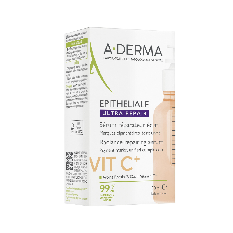 A-Derma Epitheliale Ultra Repair Sérum Reparador Vit C corrige marcas pigmentares, desintoxica e devolve luz à tua pele, formulado com 99% de ingredientes de origem natural e alta tolerância.