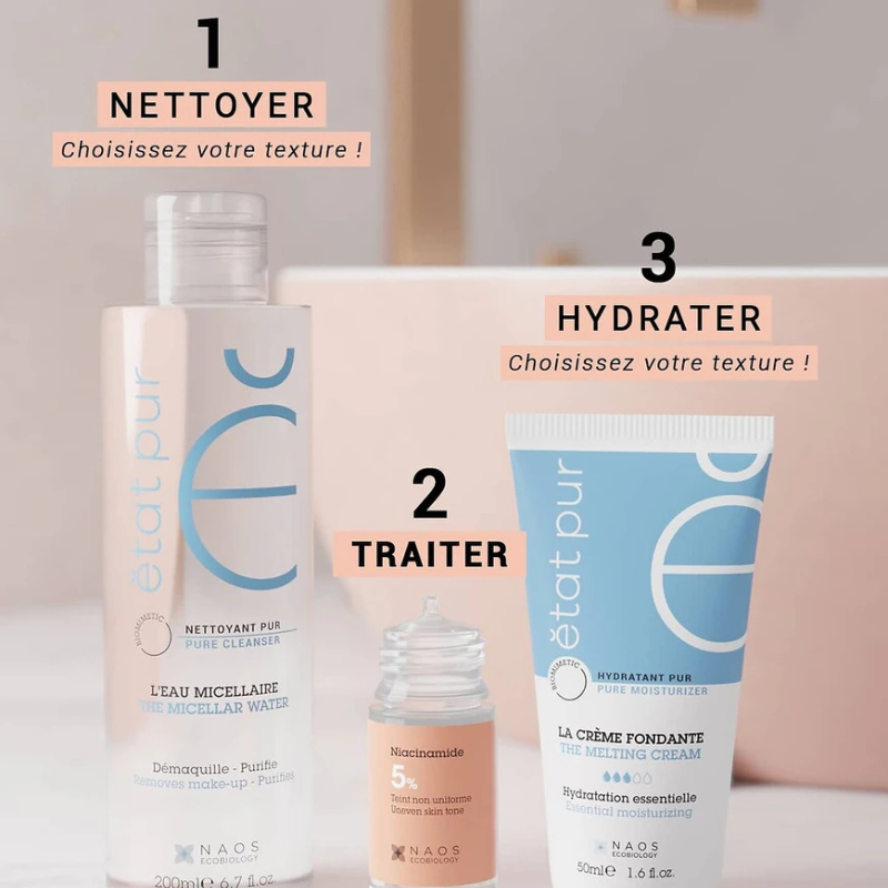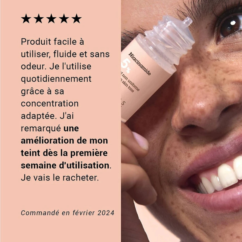 Niacinamida 5%: um corretor eficaz para manchas, vermelhidão e tom de pele irregular. Uniformiza, acalma e ilumina a tez.
