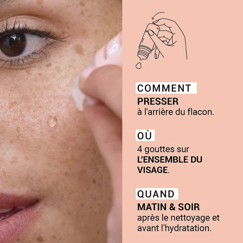 Sérum reparador com 99% de ingredientes naturais que corrige marcas pigmentares em 15 dias, ilumina e uniformiza a pele. Sem perfume, vegan e não comedogénico.