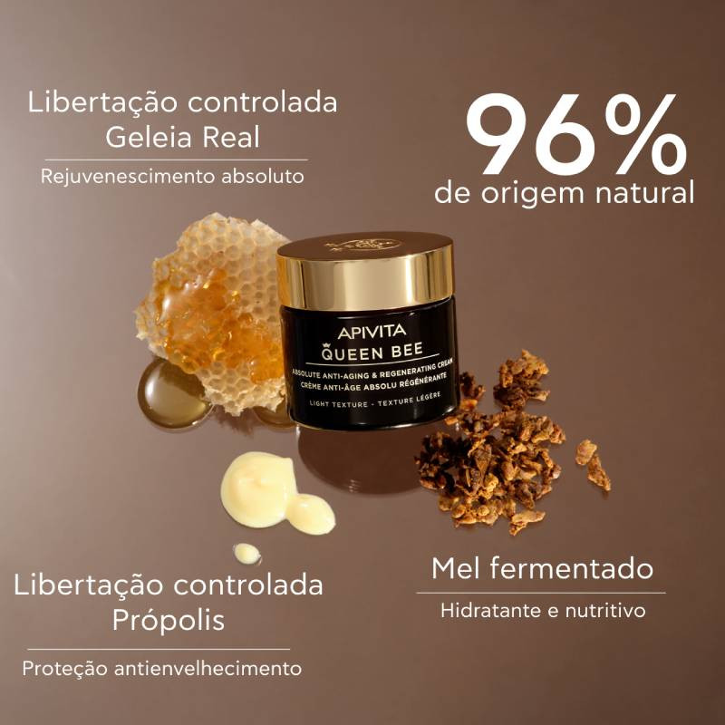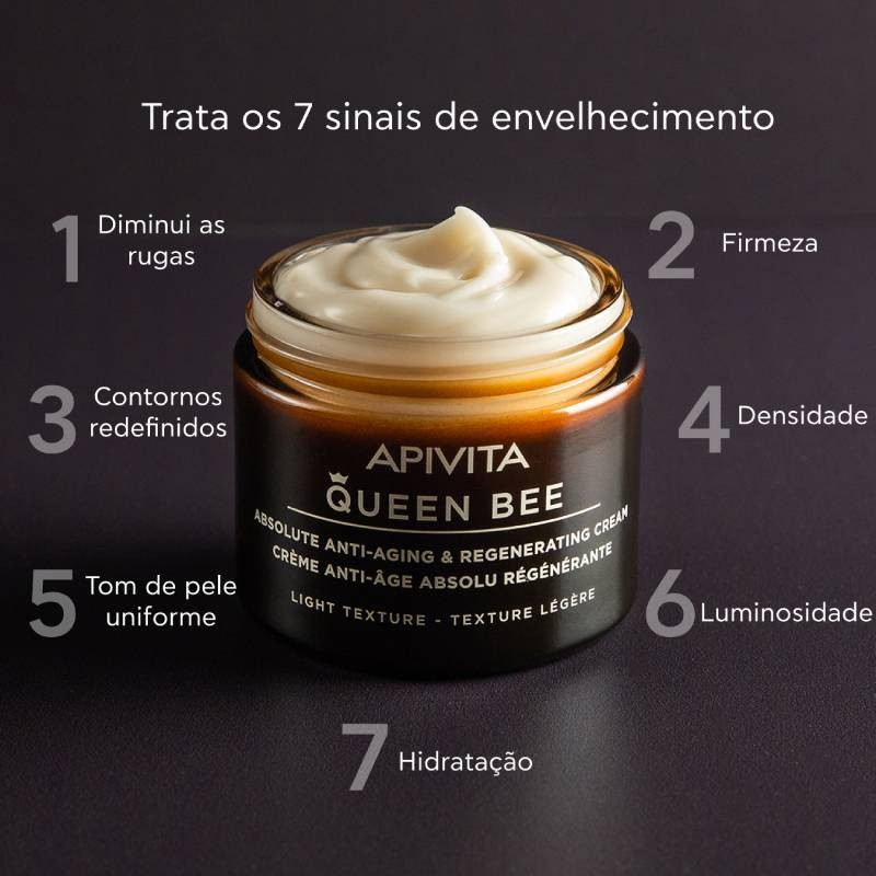 Apivita Queen Bee Creme Ligeiro 50ml é um cuidado de rosto para pele normal a mista, reduz as rugas, aumenta a firmeza da pele e define os contornos faciais.