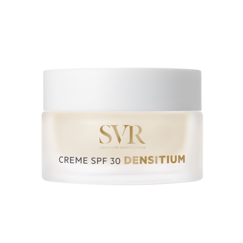 Creme Densitium SPF30 da SVR, formulado para pele madura com rugas profundas, manchas escuras e falta de firmeza. Ação antirrugas, refirmante e fotoproteção UVB/UVA/IR/luz azul. Pele normal a seca. Uso diário.