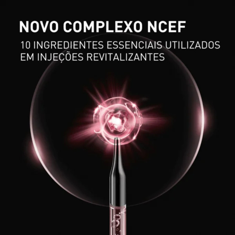 Sérum antienvelhecimento de alta performance que atua profundamente na qualidade da pele, graças ao exclusivo Complexo NCEF (10%), um concentrado com 10 ingredientes ativos encapsulados numa fórmula inovadora, entre eles: