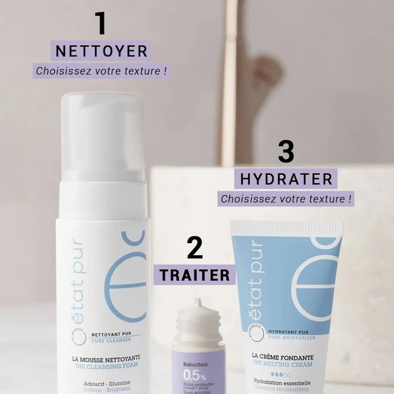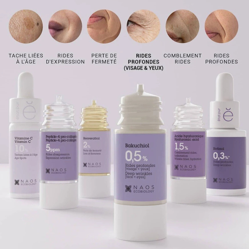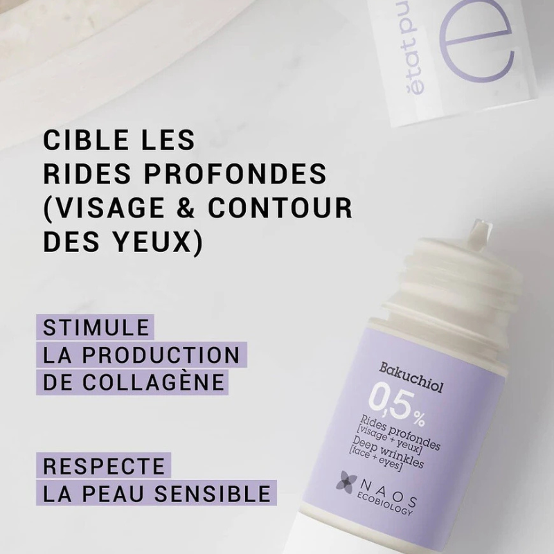 O sérum Bakuchiol 0.5% da Etat Pur, uma inovação no cuidado antienvelhecimento que oferece resultados visíveis com a tolerância que a sua pele sensível merece. Formulado com Bakuchiol Ativo Puro a 0.5%, este sérum é uma alternativa natural e de alta eficácia ao retinol, suavizando as rugas mais profundas no rosto e na delicada zona do contorno ocular.