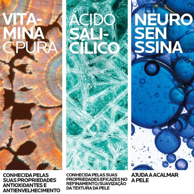 Formulado com 12% de Vitamina C Pura, este cuidado de rosto combate os sinais visíveis da idade, melhora a luminosidade e uniformiza a tez. A sua fórmula avançada também inclui ácido salicílico, que refina a textura da pele, e neurosensina, um poderoso ativo calmante.