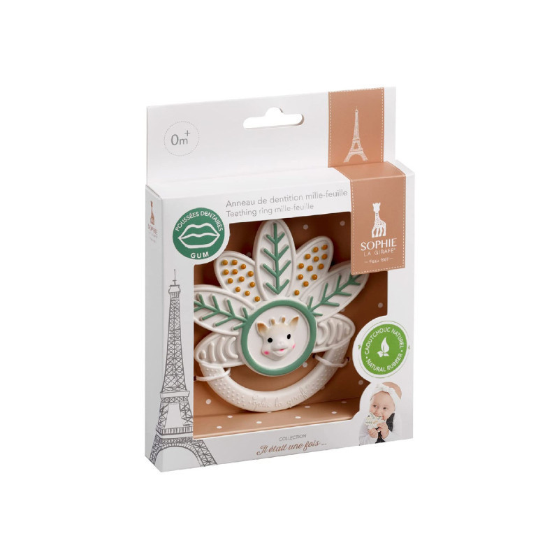 Sophie La Girafe Anel Milfolhas +0M é um anel de dentição macio, adequado para bebés desde o nascimento. Apresenta diferentes texturas e estimula os 5 sentidos, uma vez que possui diferentes relevos e é agradável para o bebé morder, durante a fase da dentição, aliviando as dores.