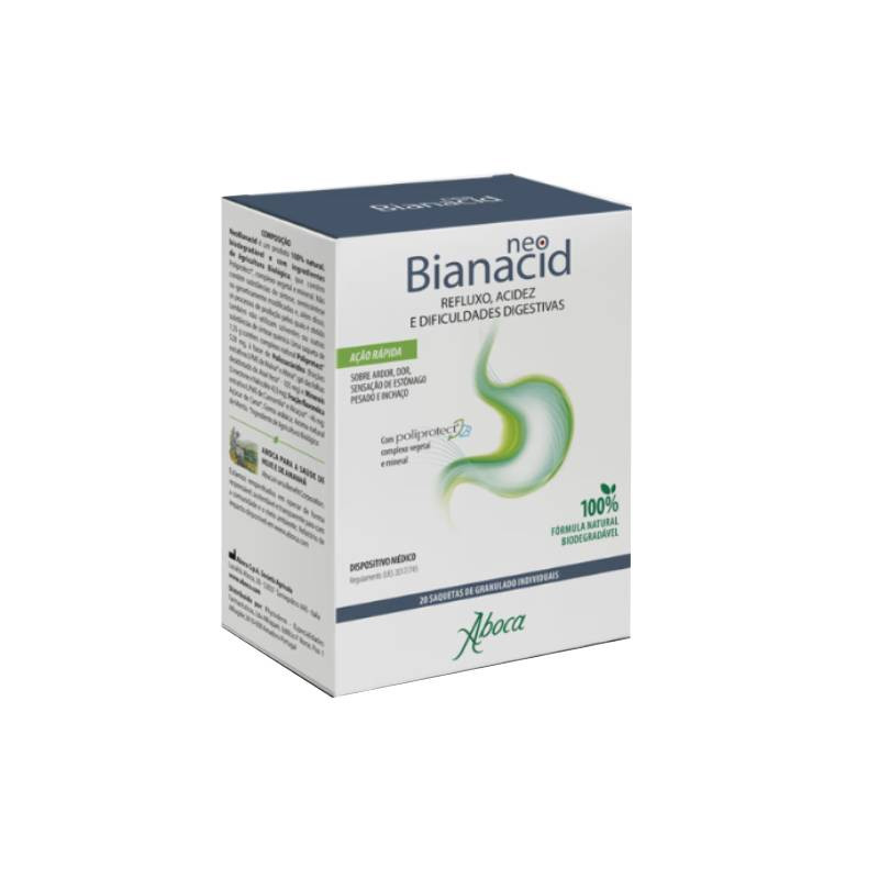 NeoBianacid Granulado Saquetas x20 é indicado para o tratamento do refluxo gastroesofágico e da dor de estômago (dispepsia dolorosa), caracterizados por regurgitação ácida, ardor, dor, tosse irritativa, disfonia.