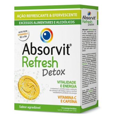 Absorvit Refresh Detox Comprimidos Efervescentes é um suplemento alimentar que ajuda a suportar as necessidades nutricionais em caso de excessos (alimentares, alcoólicos, tabágicos ou outros), contém vitaminas C e B2, que contribuem para a proteção das células contra as oxidações indesejáveis e para a redução do cansaço e da fadiga. A vitamina B6, tal como a vitamina C, auxilia no metabolismo produtor de energia e ao normal funcionamento do sistema imunitário.
