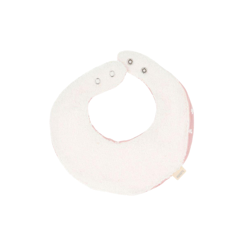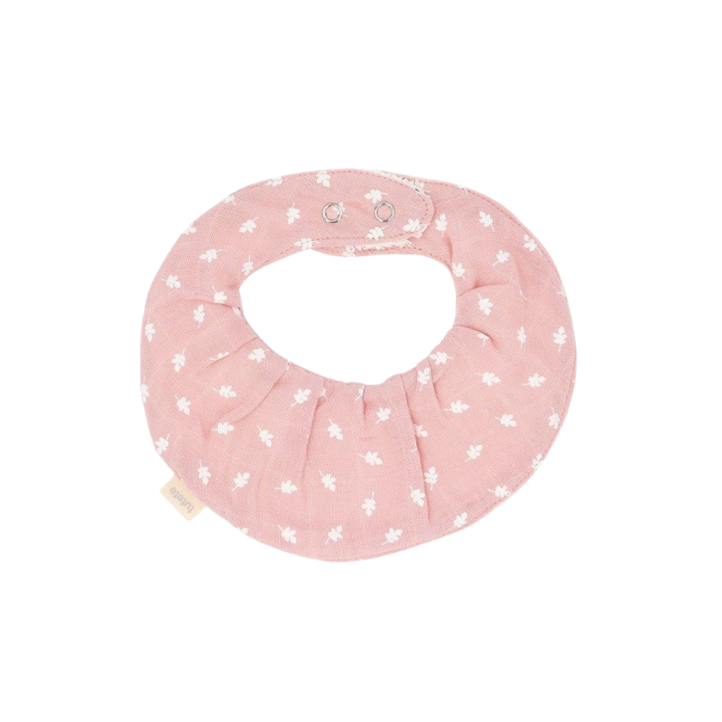 Seca babinhas Tutete Leaves Pink, feito em musselina de algodão com forro absorvente. Suave, delicado e ideal para a fase da dentição. Com dois fechos de pressão. Feito à mão em Espanha.