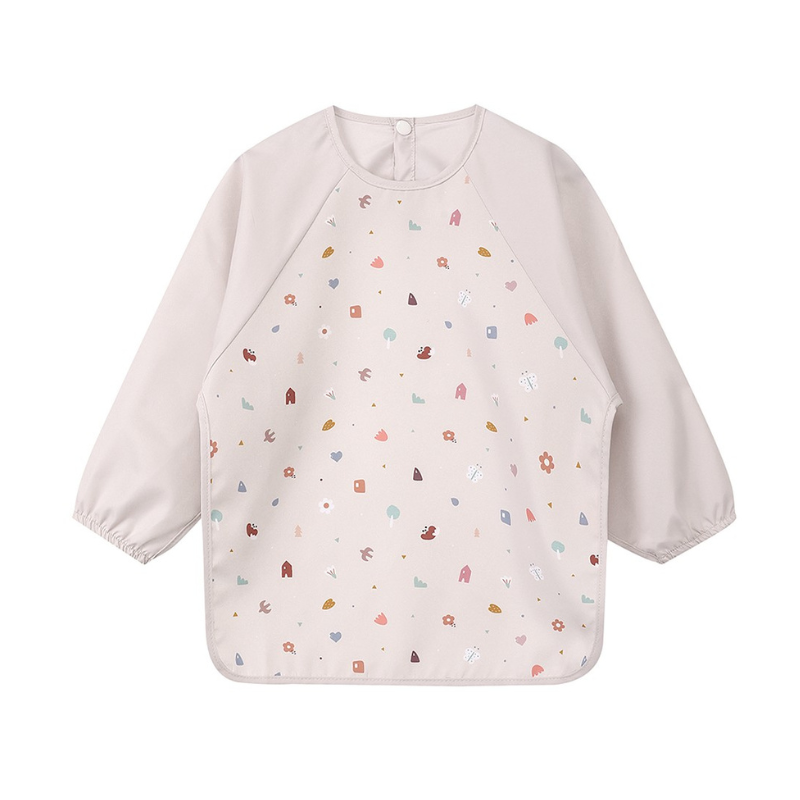 Babete impermeável com bolso e estampado suave da coleção Nature. Fecho com molas de pressão, material resistente à água e ideal para o dia a dia dos mais pequenos.