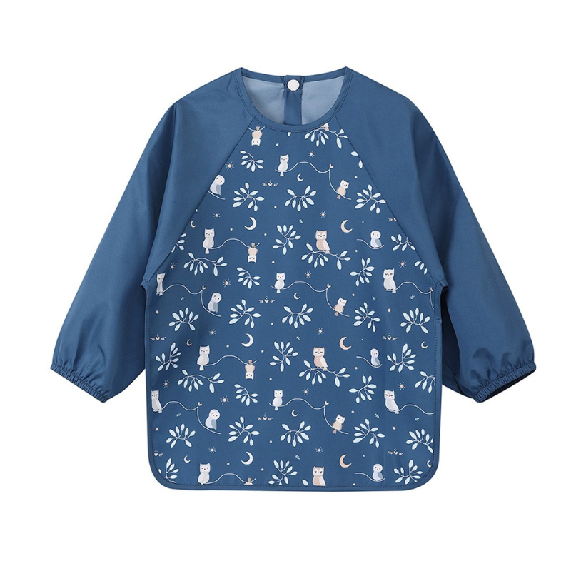 Babete de proteção total com mangas compridas, ideal para bebés dos 6 aos 24 meses. Feito em material resistente à água, com bolso largo para recolher alimentos e fecho de velcro. Fácil de limpar e lavável na máquina.