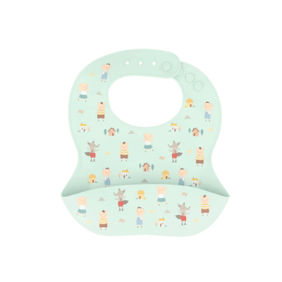 Babete de silicone macio com bolso para migalhas, ajustável e fácil de limpar. Com ilustração dos Três Porquinhos, ideal para tornar as refeições mais divertidas e práticas.