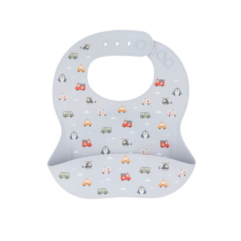 Babete de silicone ajustável com bolso para migalhas e estampado divertido de carros. Antialérgica, fácil de limpar e ideal para tornar as refeições mais educativas e sem sujidade.