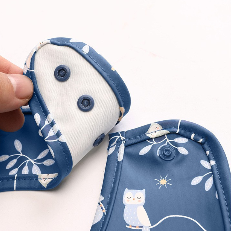 Babete impermeável com bolso e estampado encantador da Floresta Mágica. Leve, resistente à água e com fecho de molas ajustável — ideal para refeições mais limpas e divertidas.