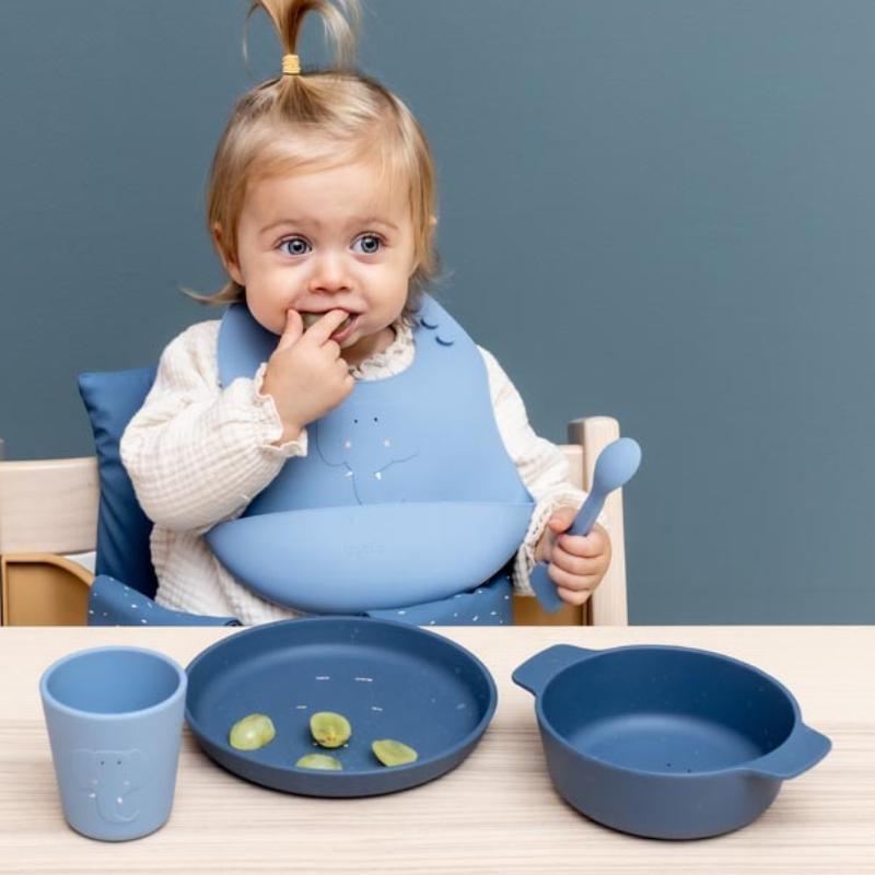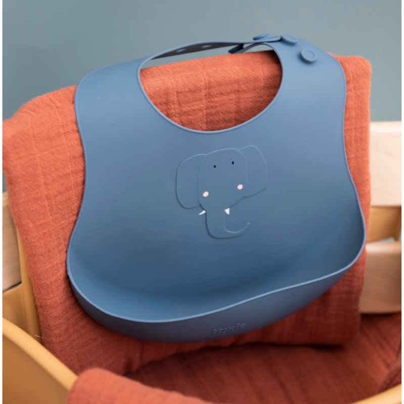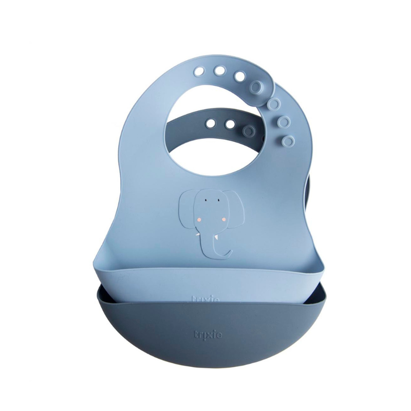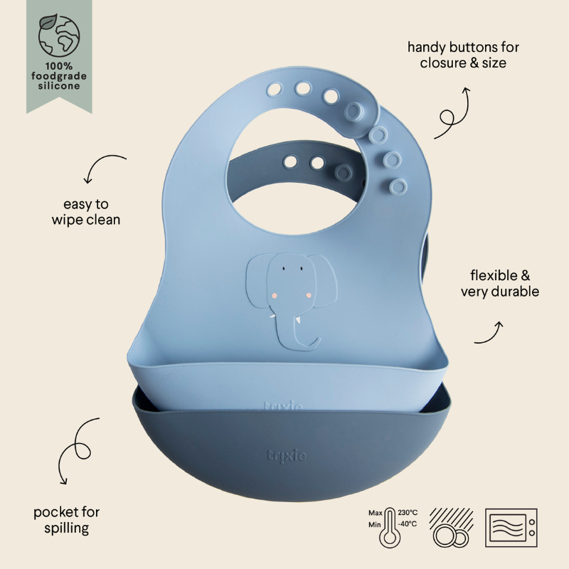 TRIXIE Babetes Silonce Mrs. Elephant é um pack composto por 2 babetes 100% em silicone de grau alimentar, seguras, resistentes e fáceis de limpar. O bolso frontal coleta migalhas e líquidos e protege a roupa do bebé.