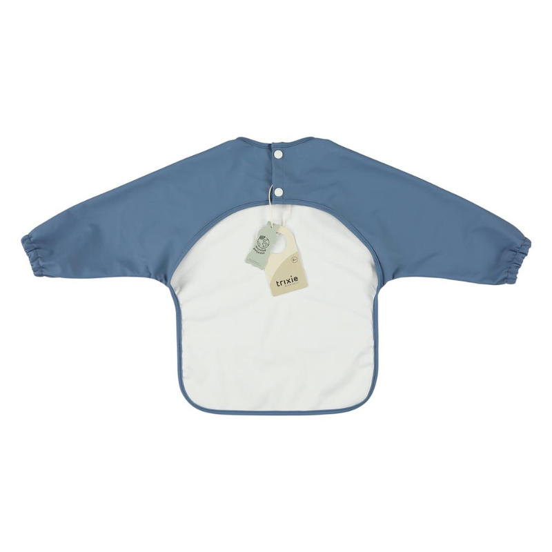 Babete de proteção total com mangas compridas, ideal para bebés dos 6 aos 24 meses. Feito em material resistente à água, com bolso largo para recolher alimentos e fecho de velcro. Fácil de limpar e lavável na máquina.