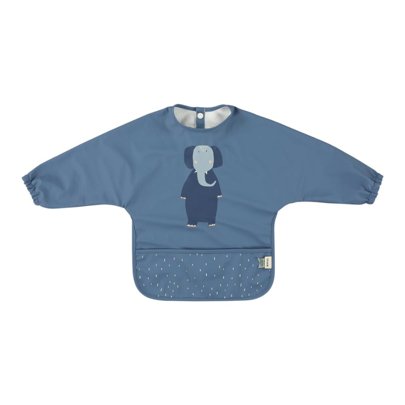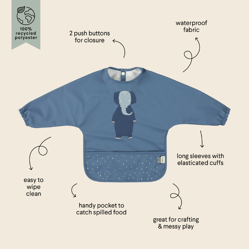 Babete com mangas, bolso coletor e estampado de Elefante, feita com tecido impermeável 100% reciclado. Mais proteção, menos bagunça!