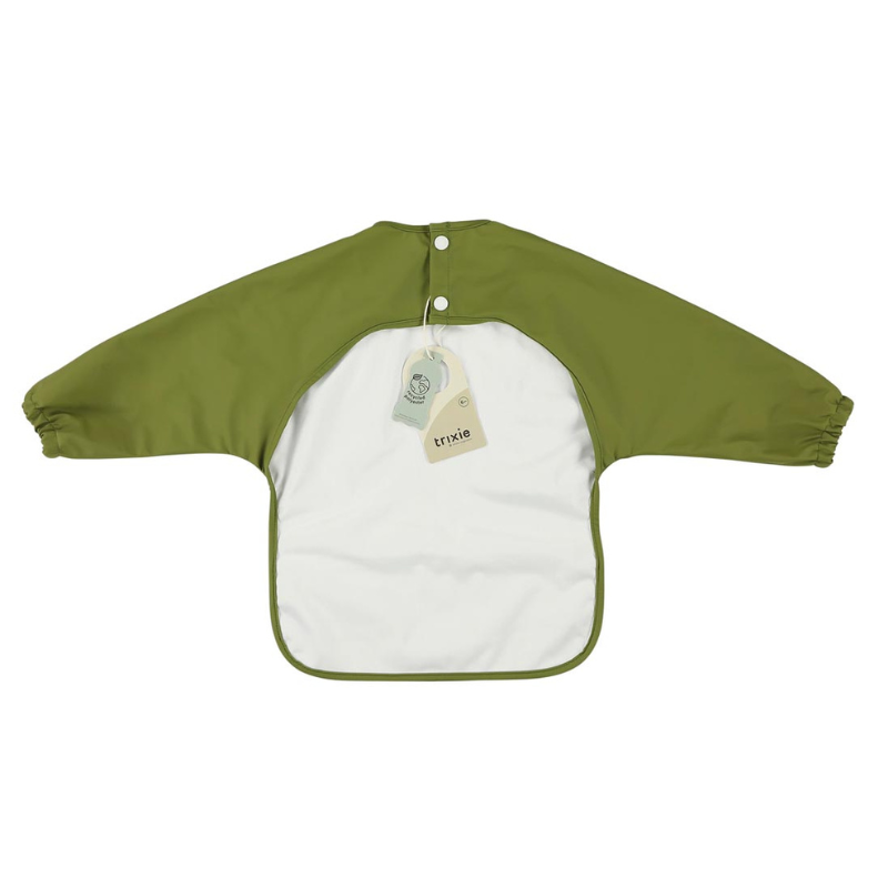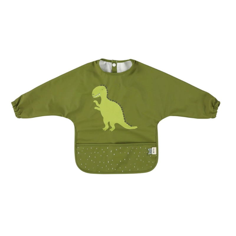 Babete impermeável com mangas e estampado de dinossauro, ideal para proteger a roupa do bebé durante refeições ou brincadeiras. Feita com poliéster reciclado e bolso frontal apanha-migalhas.